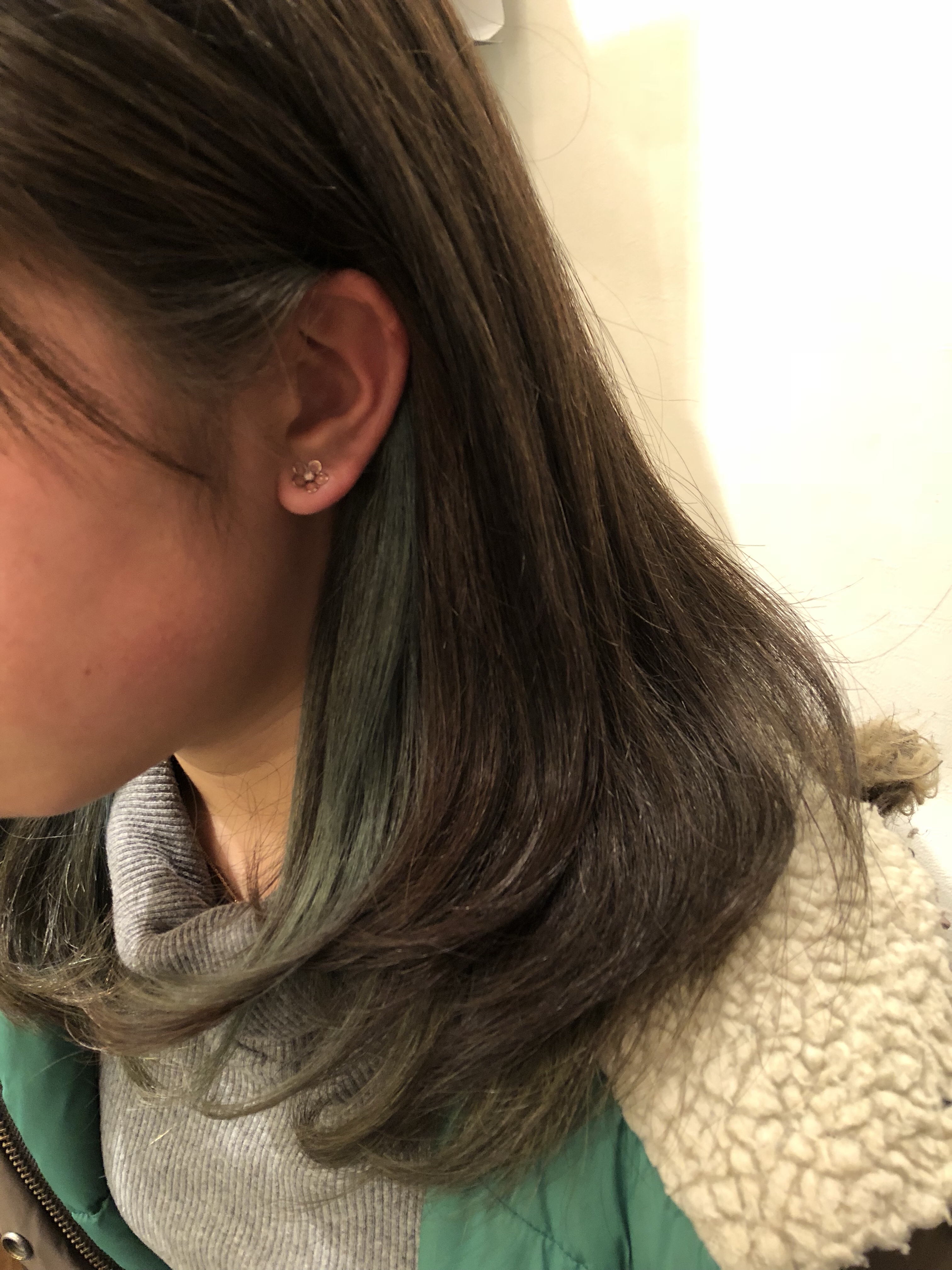 今日は初めてカラーをされる学生さん といっても、全体的にいれるのでなく インナーカラーでビビットなカラーでもなく くすんだグリーンで もともとの地毛の色が明るい毛質なので ブリーチもはやくぬけました(^^) 卒業まで楽しめたらいいですねー
