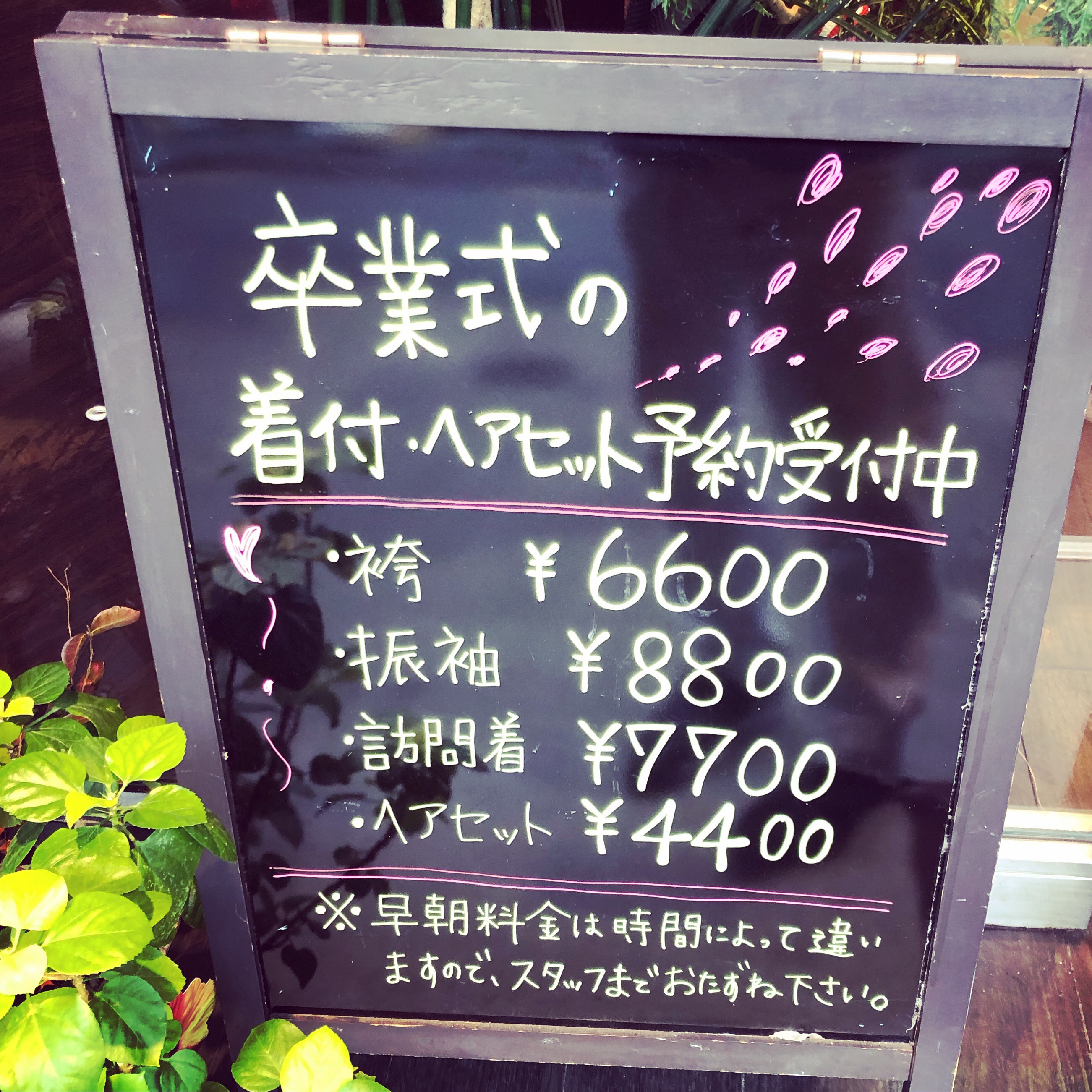 御卒業、御入学、謝恩会などのご予約を受付中です^ – ^ 御卒業、ご入学、ご就職誠におめでとう!!ございます^ – ^^ – ^ 早朝からのご予約もお気軽にお問い合わせ下さいませ^ – ^ 貸衣装等のご相談もお気軽にお声掛けください^ – ^ 袴¥6600 振り袖¥8800 訪問着¥7700 セット¥4400 早朝料金¥3000