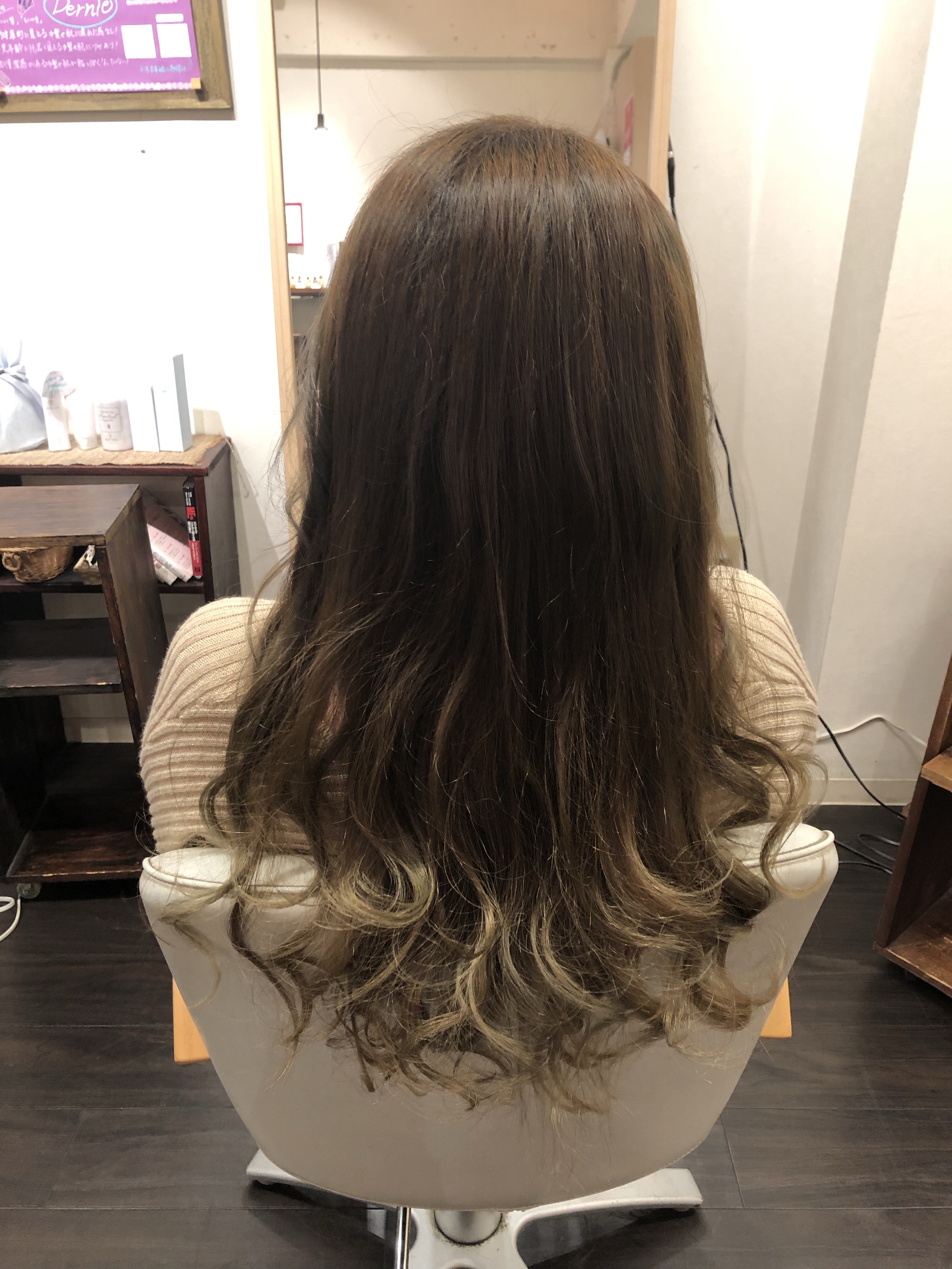 久しぶりにご来店頂き、10センチくらいはカットさせて頂きました^_^ それでもこのくらいの長さではあります! ハイライトを毛先に入れてからの アッシュ系でかけました! ブロー頑張って下さい(^○^)