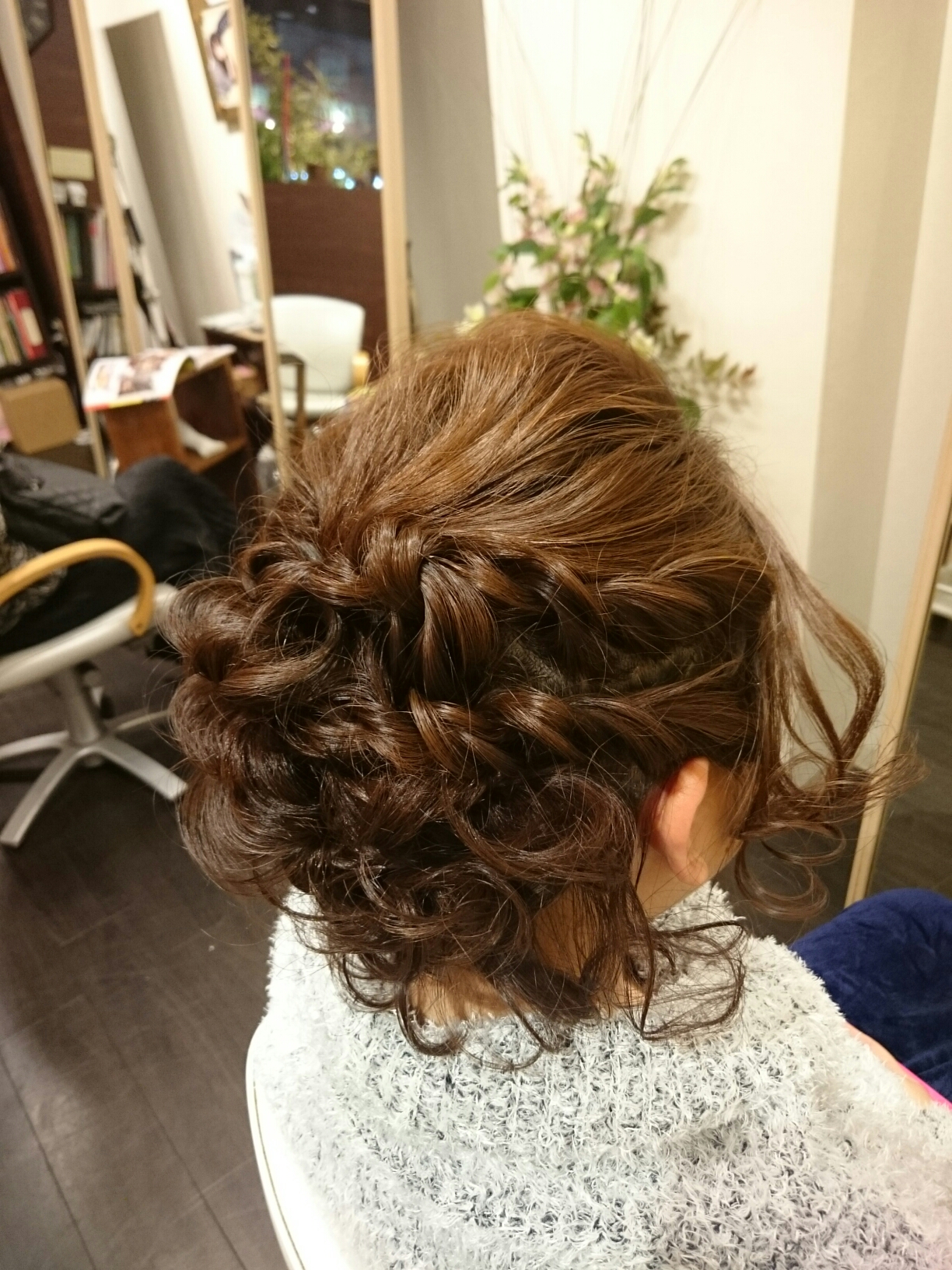 今日はお誕生日を皆にお祝いしてもらうらしいです(^3^)/~☆ いつもは、ストレートで大人っぽい感じが多いので、今日は可愛いイメージで\(^-^)/ ドレスもスカイブルーの華模様で、キラキラしてる感じだったので、ヘアーはクリクリカールのフワッと優しい感じにしてみましたー(^3^)/~☆ 今日はいっぱいお酒も飲まなきゃねー(>_<)