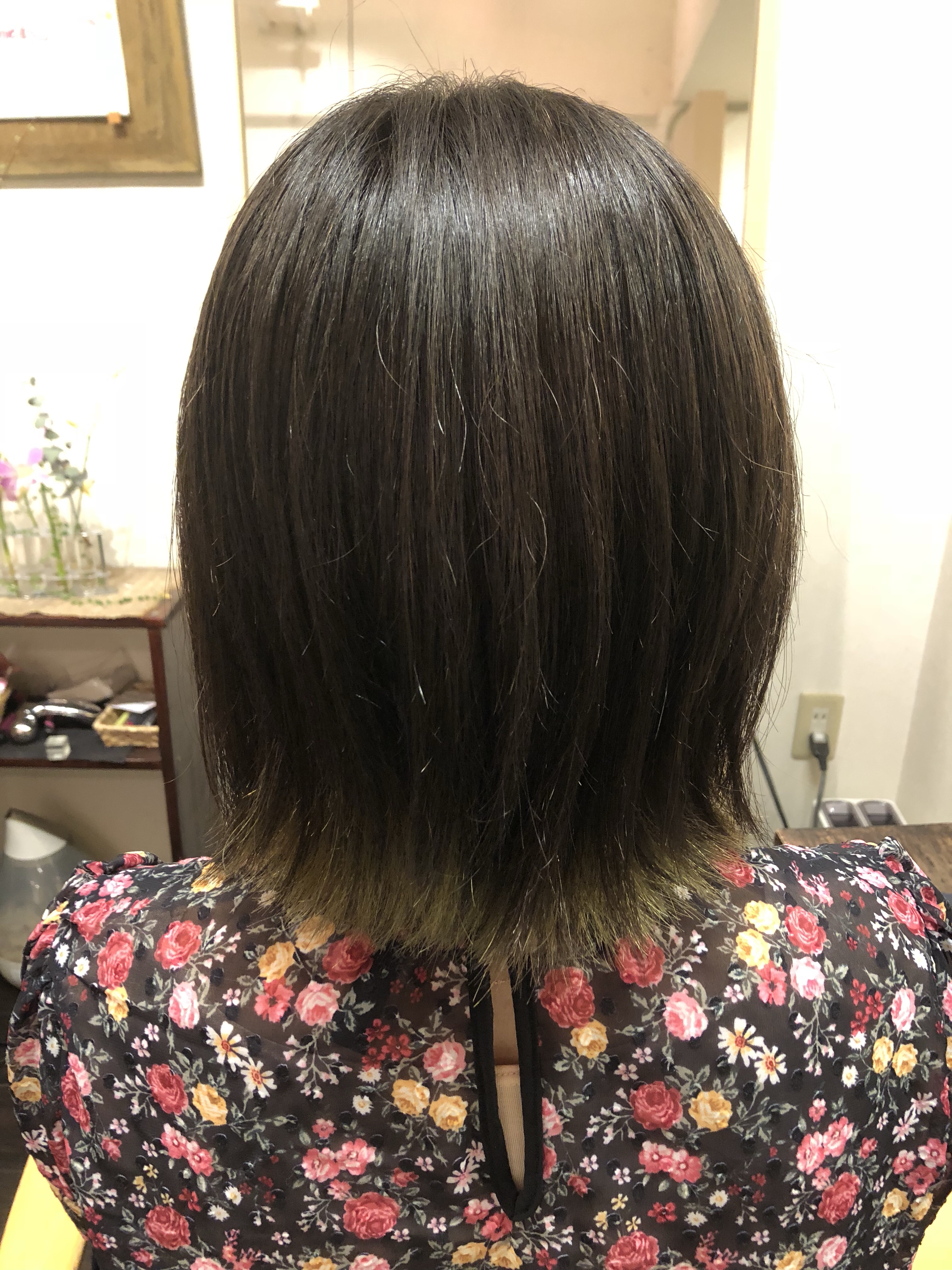 卒業に向けてアップができるようにのばして インナーカラーでブリーチをして グリーンにしてたのを 入学にむけてボブスタイルにバッサリときり かつ、インナーカラーをいかしてできました(≧∇≦)