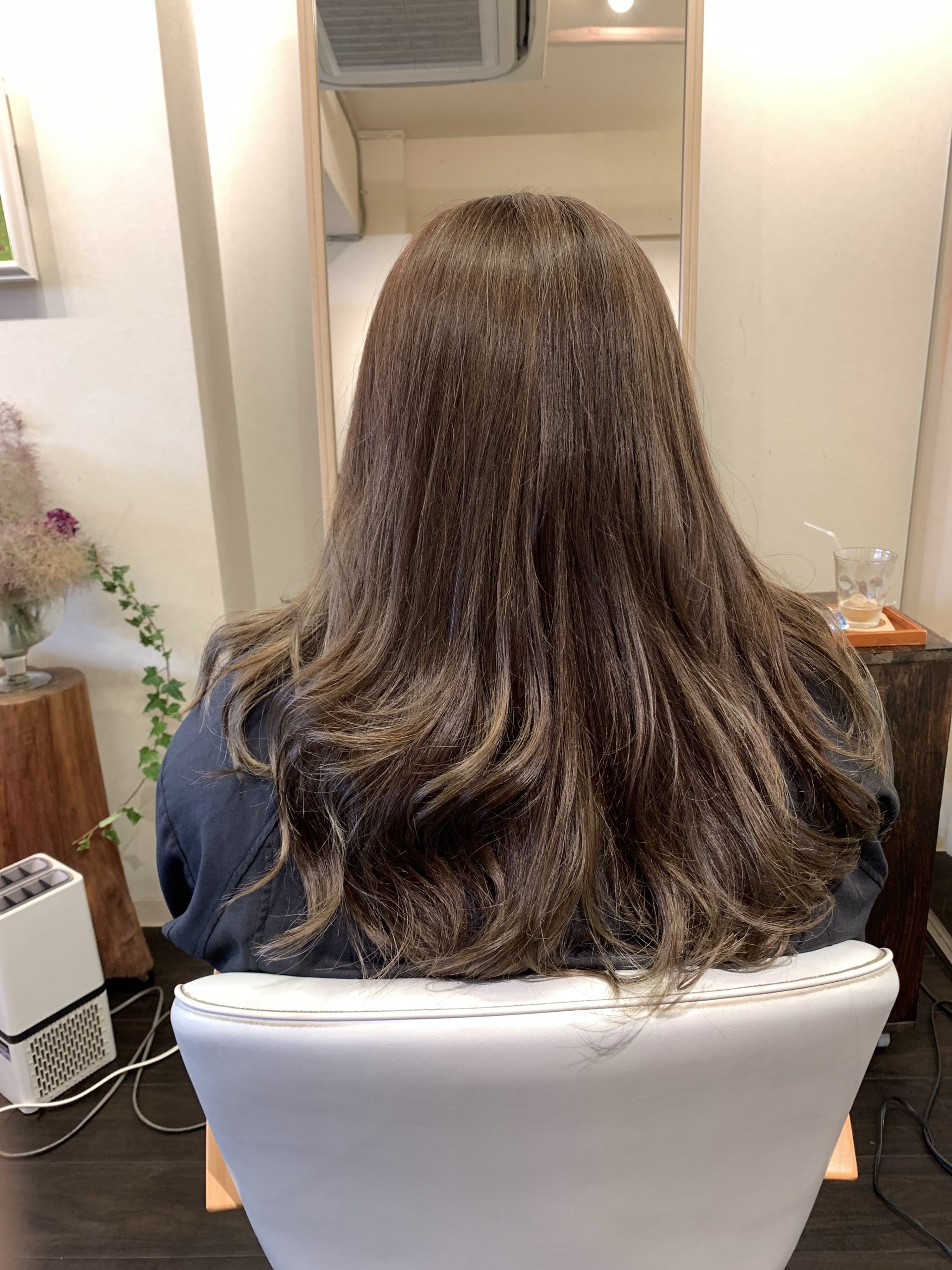 フロントは白髪が多くて、ネープのあたりは白髪が少なくてという方は割と多いと思います 1番目立つところからすぐ白髪が出てくるので しっかり白髪染めをしてしまうと逆に白髪が目立ってしまうので、ハイライトを多めの入れて、その上から赤みを押さえて色味を入れることで、なんとなく白髪もボケます^_^ 仕上がりは明るめになりますが、白髪は目立ちにくくなりました!