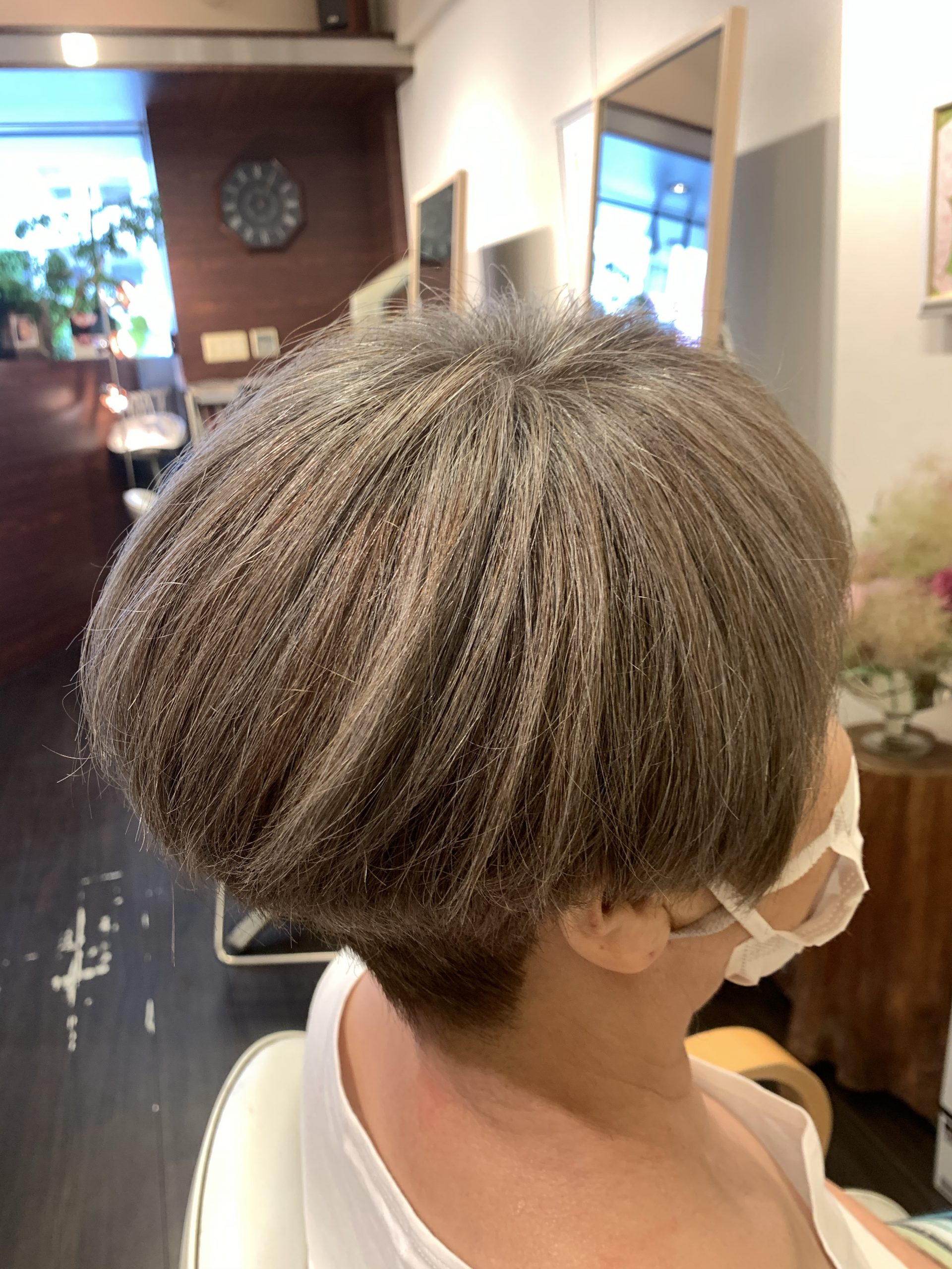 グレーヘアーを楽しんでいただけるようになり、お家のシャンプーもカラーシャンプーを色々ためしてくださりと、オシャレを楽しんでおられるお客様 今回はいつものスタイルの中で、少し変化をつけて アシンメトリーにしました マスク生活でピアスも忘れがちですが、 耳たぶが見える長さだとピアスも楽しめそうです