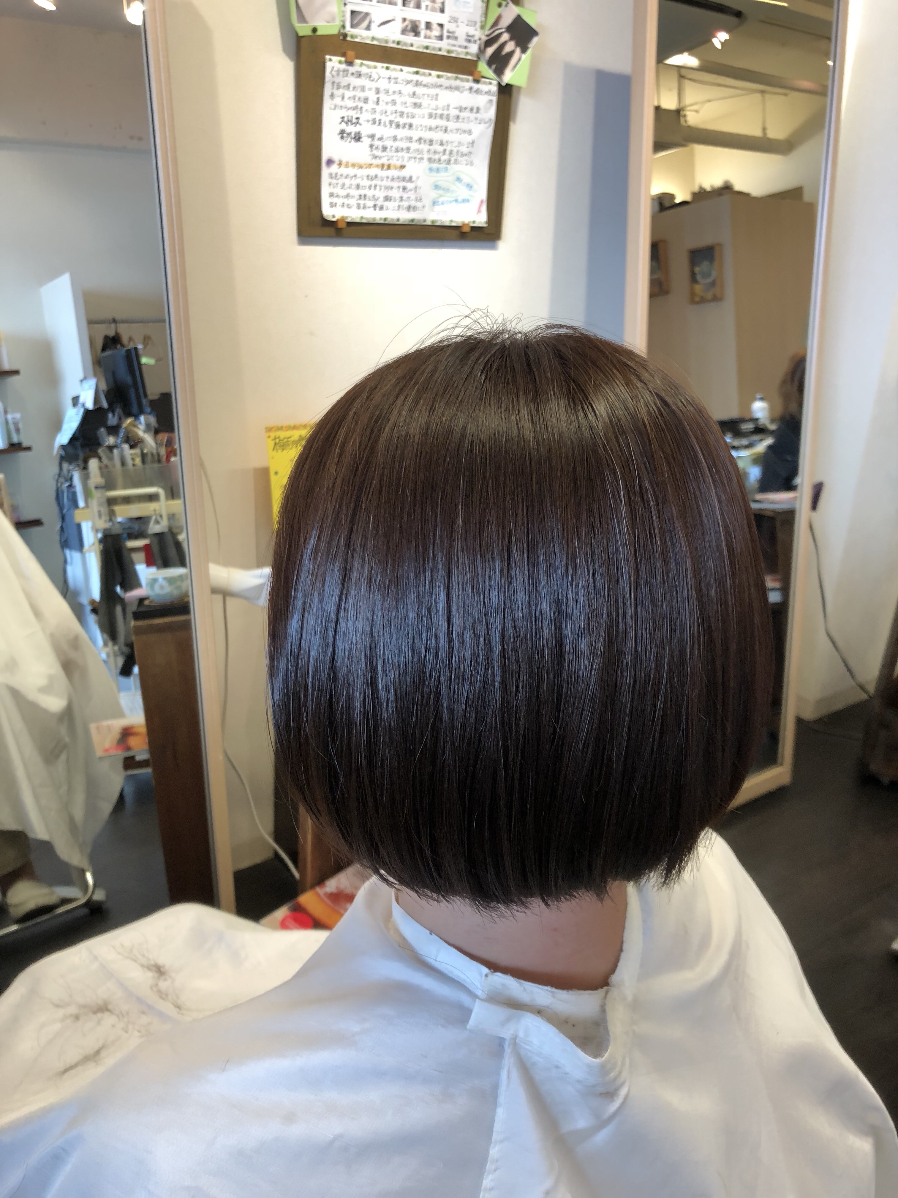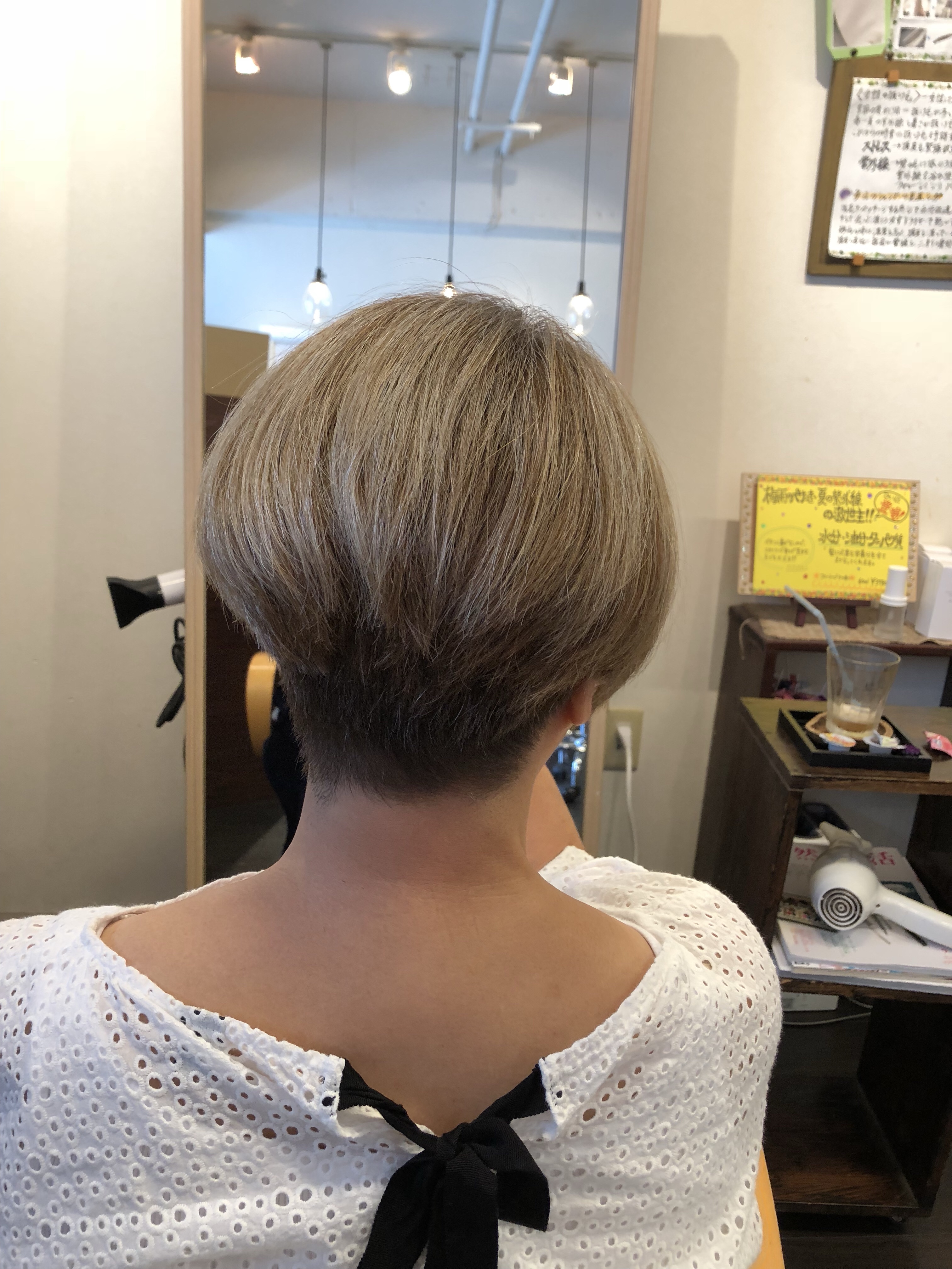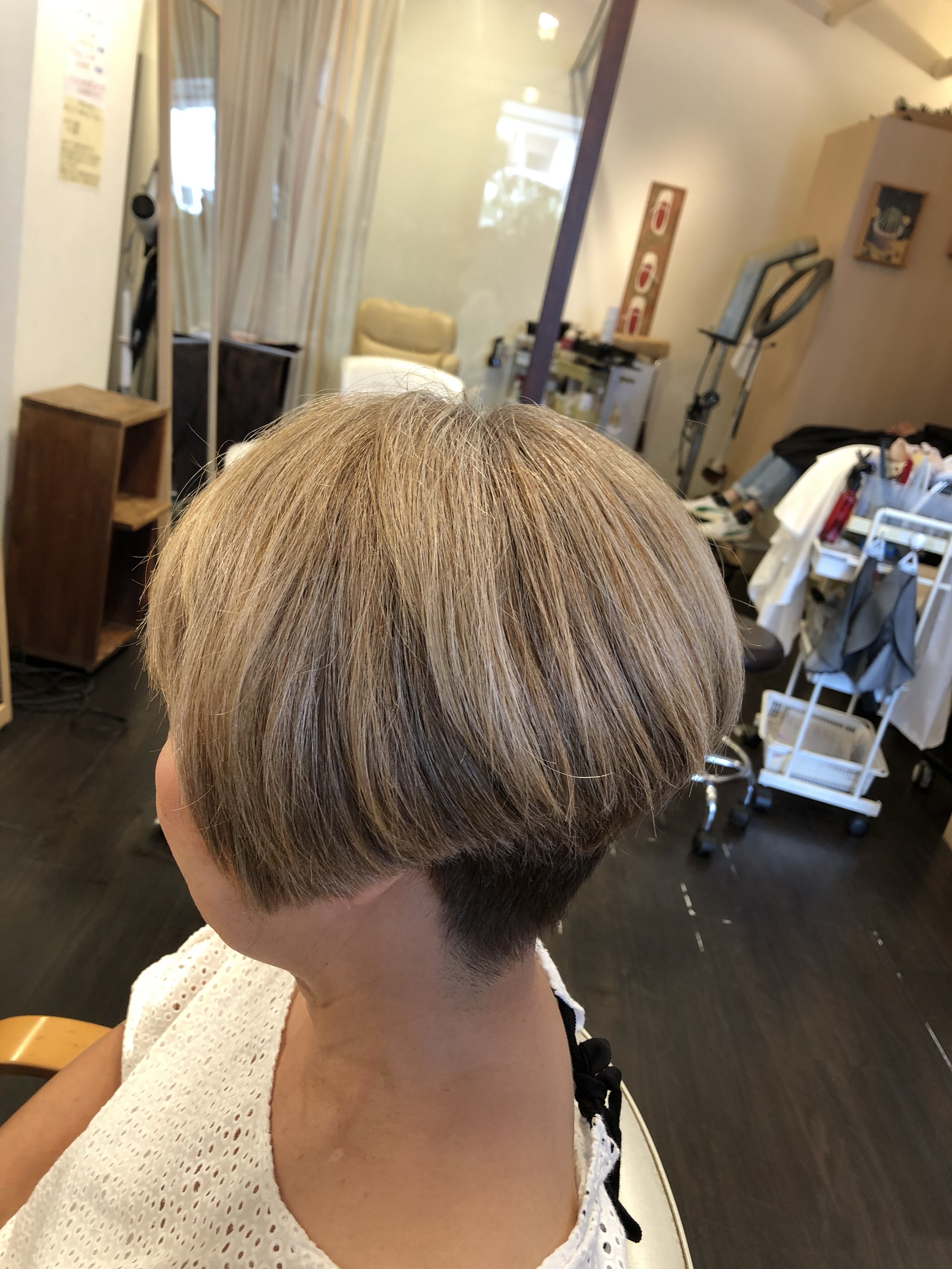 白髪をそめるというよりも 黒い髪の方をオシャレに染める感じで ネープの部分は黒い髪が多いので 明るくしてもこのくらいの仕上がりで でも全体的にネープはしまった色味のほうが 頭も小さく見えますね!