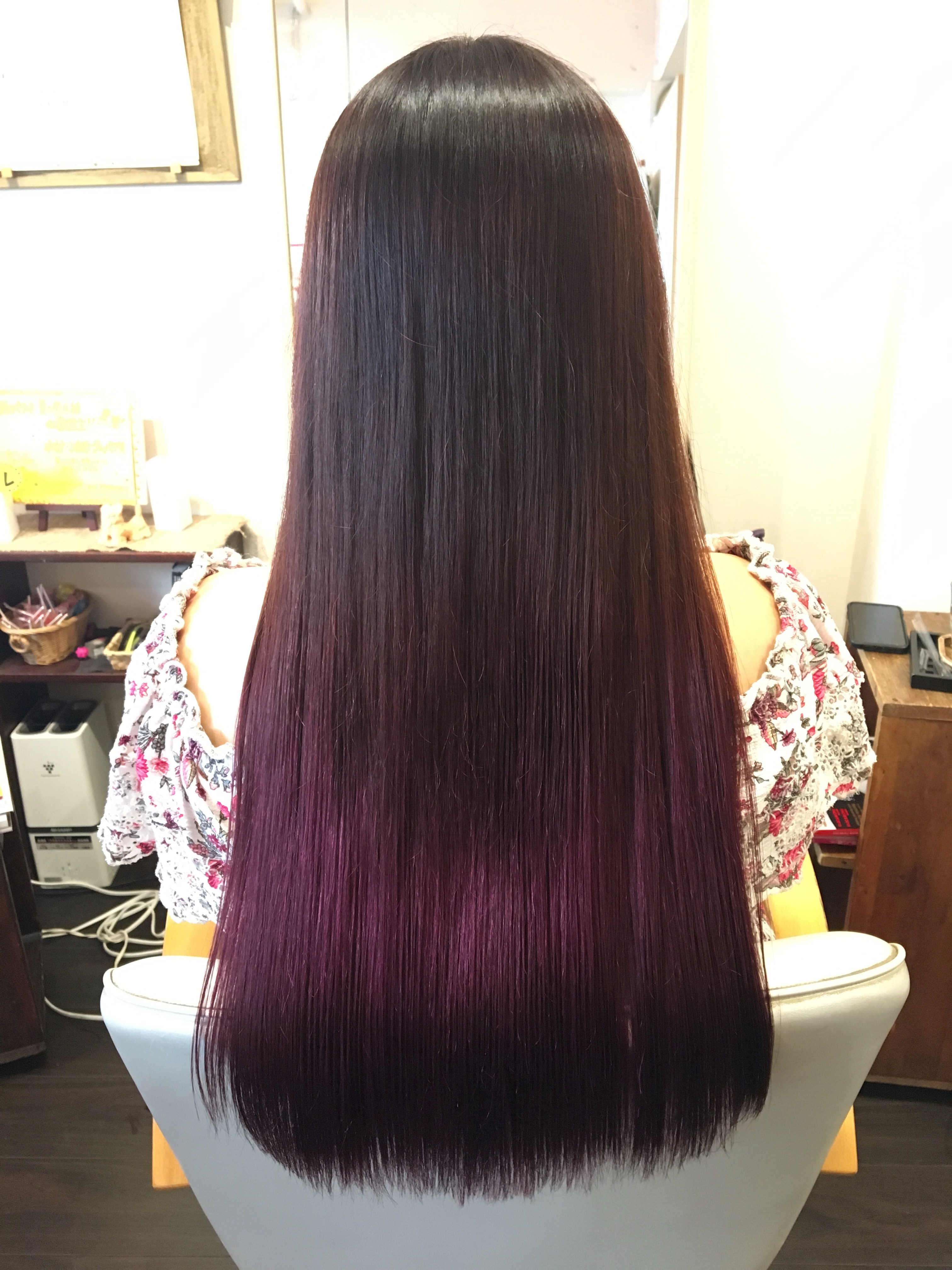 いつもいろんなカラーにチャレンジするお客様で、今回はピンクバイオレットです(b゚v`*) 2年前は鮮やかなピンクでした! なつかしい〜(。-∀-) 毛先はブリーチを1回してから色を入れてます。 髪の毛強いねぇ〜って話をしながらブリーチしてました(笑) だって2年前の鮮やかピンクの時にしたブリーチが毛先には残ってるのに、ツヤがでる☆ ロングヘアなのに素晴らしいです(*≧∪≦) いつもホームケアをし...
