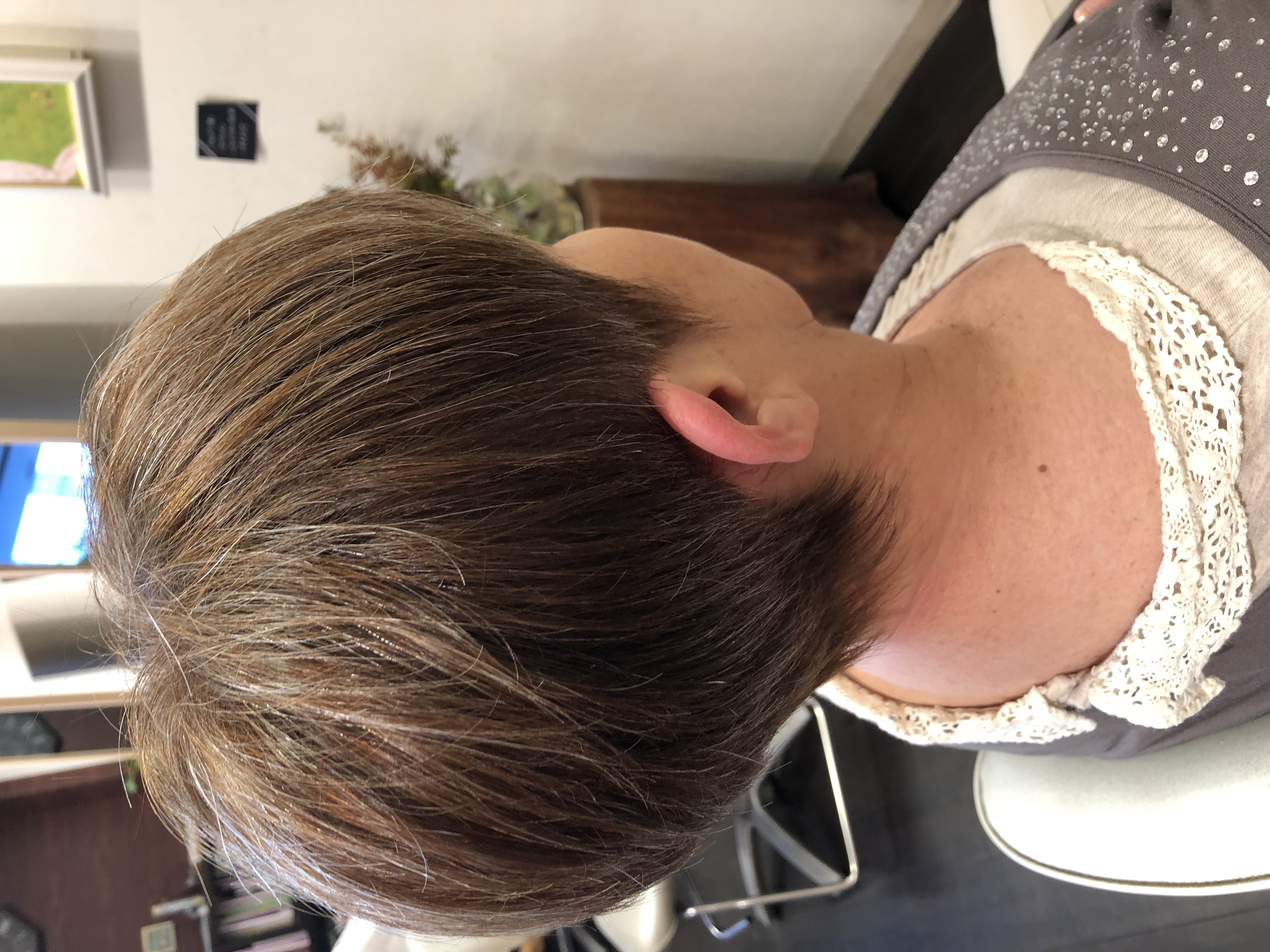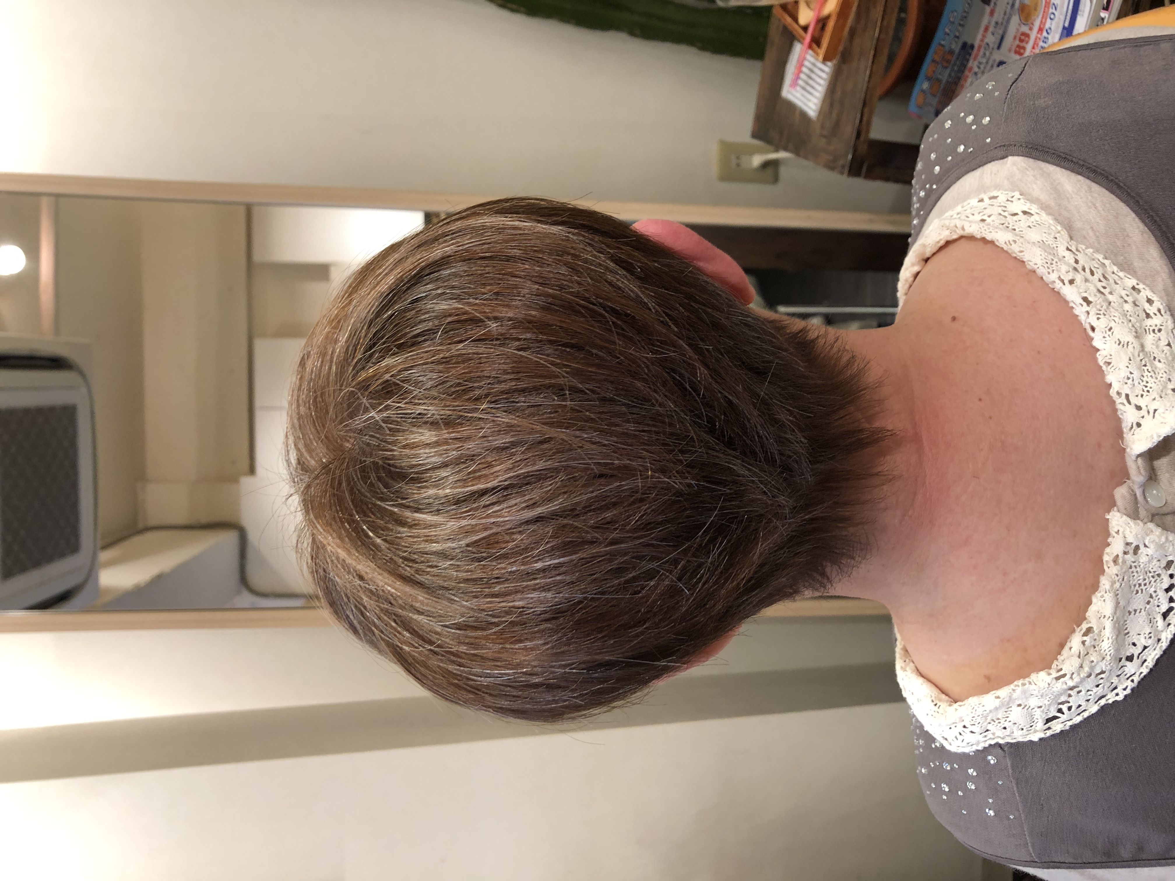 つい最近まで白髪染めをしていましたが しっかりと染めるのをやめて オシャレ染めに変えました! アッシュ系の10トーンで染めると、白髪が透明感のある明るい色の仕上がりになります! 徐々に白髪染めをやめても行けるし、このままでは明るいのを楽しまれてもいいですね! 伸びてきても気にならないようです!